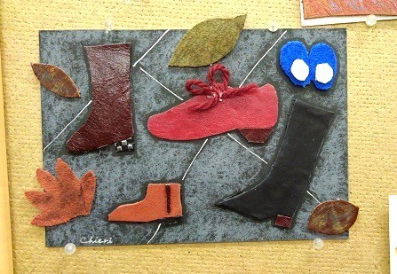 革の端切れと毛糸とボンドとオイルパステルと銀ペンが画材です